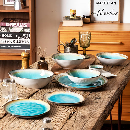 8 Inch Sea-Blue Crackle Glaze Water-Drop Ceramic Bowl