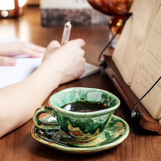 Vintage Emerald Rustic Glazed Coffee Cup & Saucer Set