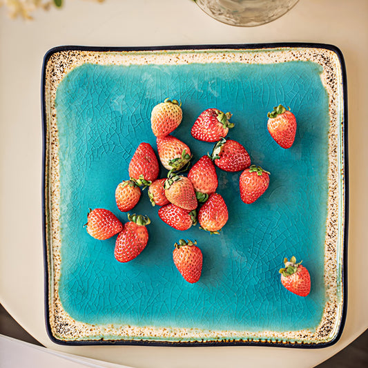 10.5 Inch Sea-Blue Crackle Glaze Square Ceramic Shallow Plate