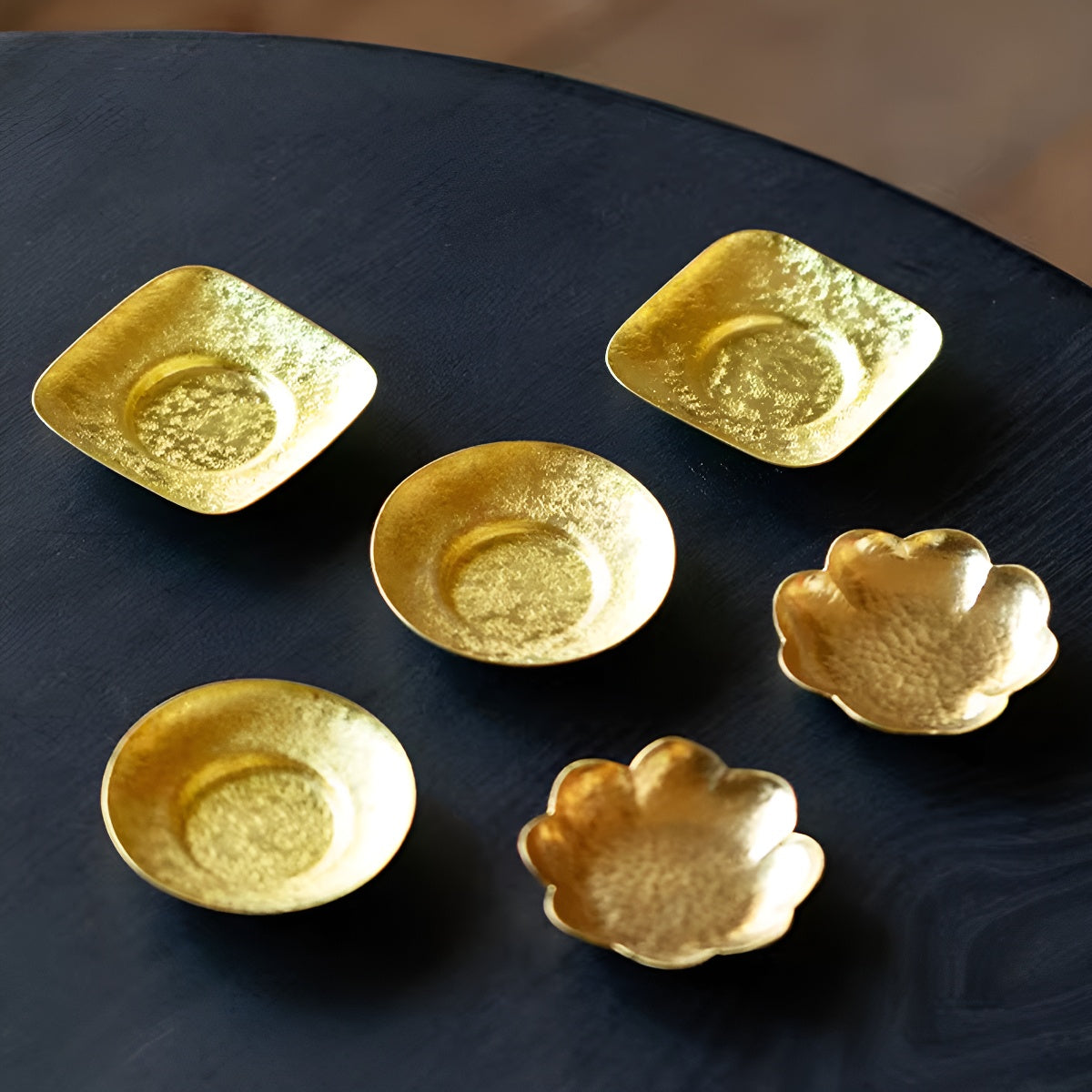 The softly hammered surface reflects light like liquid gold, creating a rich visual contrast against porcelain, ceramic, or glass cups.