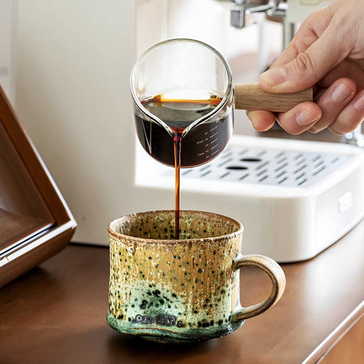 The mottled green finish and rugged ceramic body bring depth and richness to every sip.
