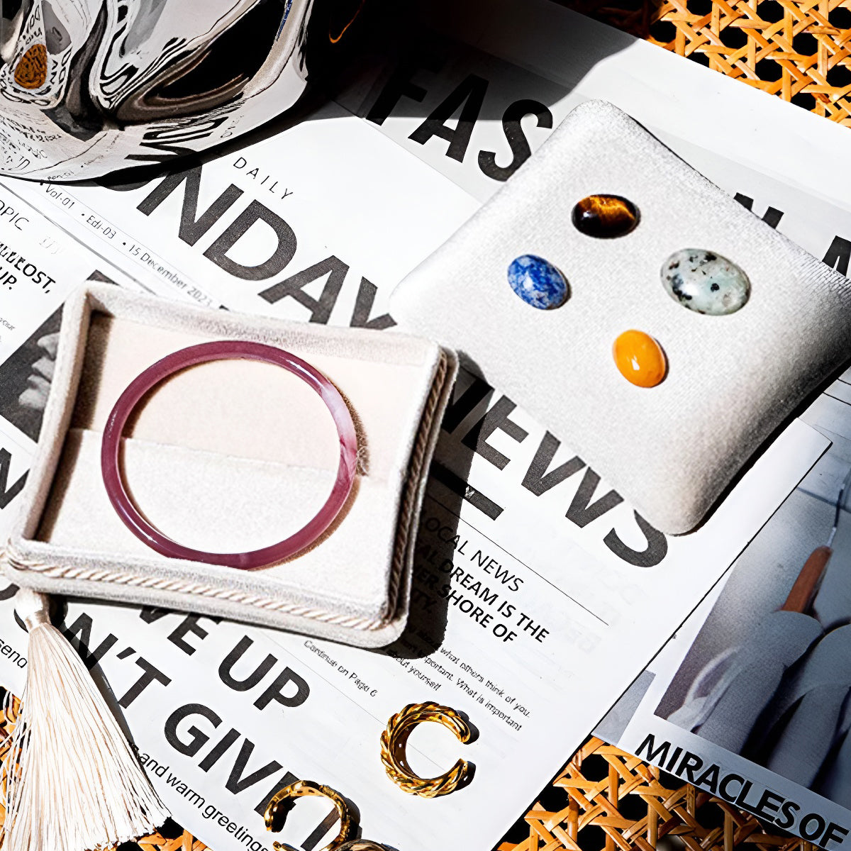 Natural Stone Decoration Velvet Travel Jewelry Case