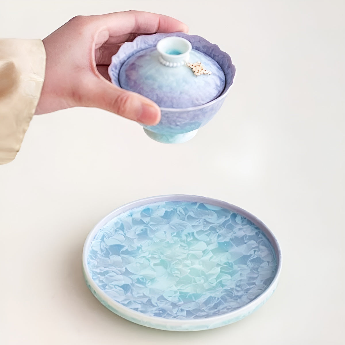 The subtle gradient of purple and aqua adds depth and softness to your tea setup, creating a calm visual centerpiece.