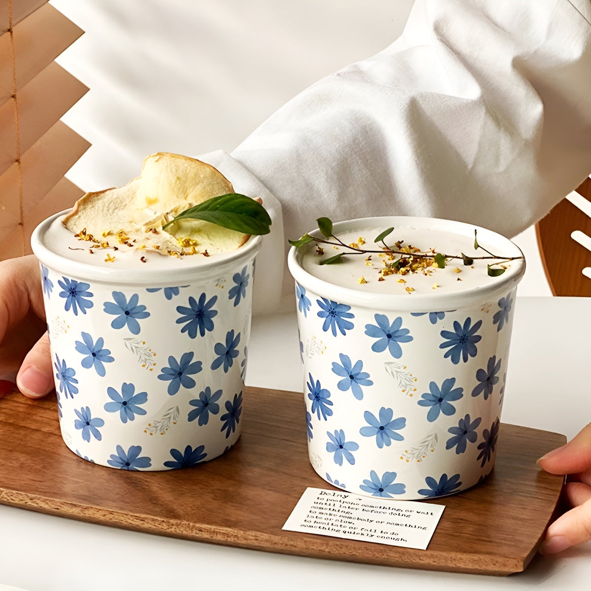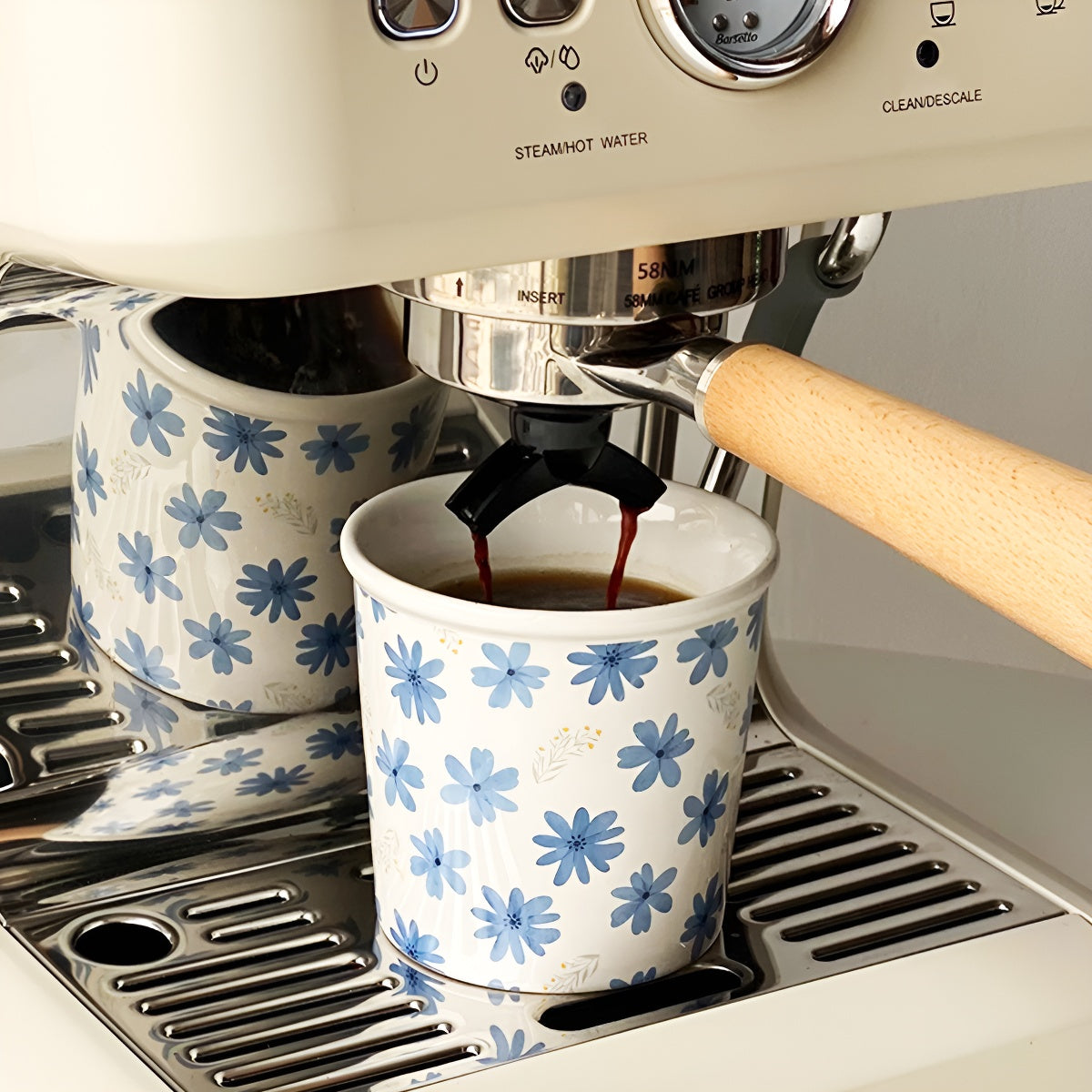 A charming mug covered in blue blossoms, perfect for lattes, tea, or hot cocoa.